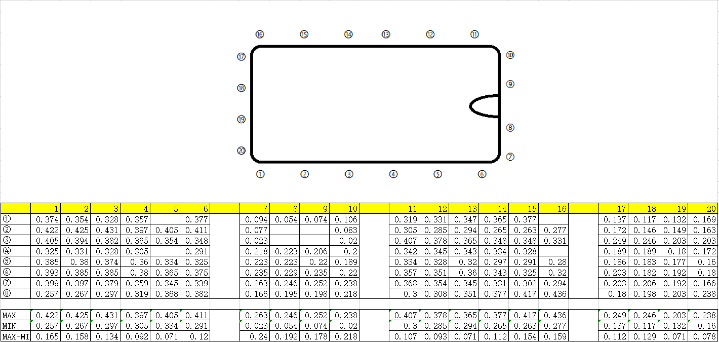 下图为同边对位时测试的8组产品的数据。用于对位的点位为①和⑥。