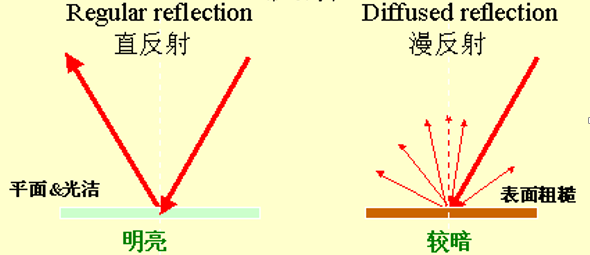 物体反射光线有两种不同的反射特性:直反射和漫反射。