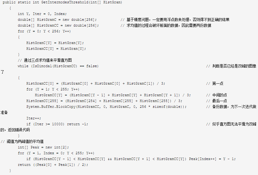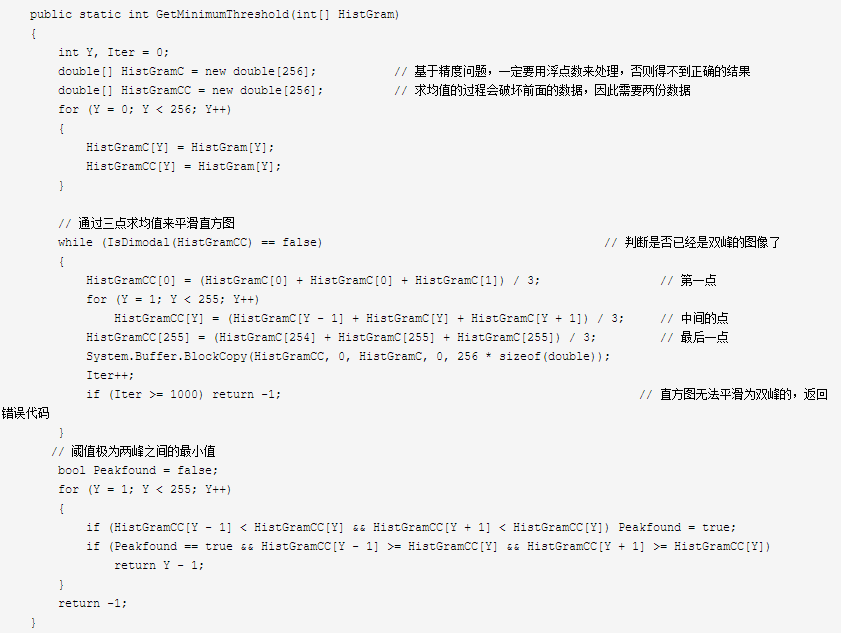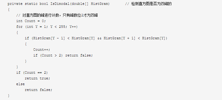 其中IsDimodal函数为判断直方图是否是双峰的函数,代码如下: