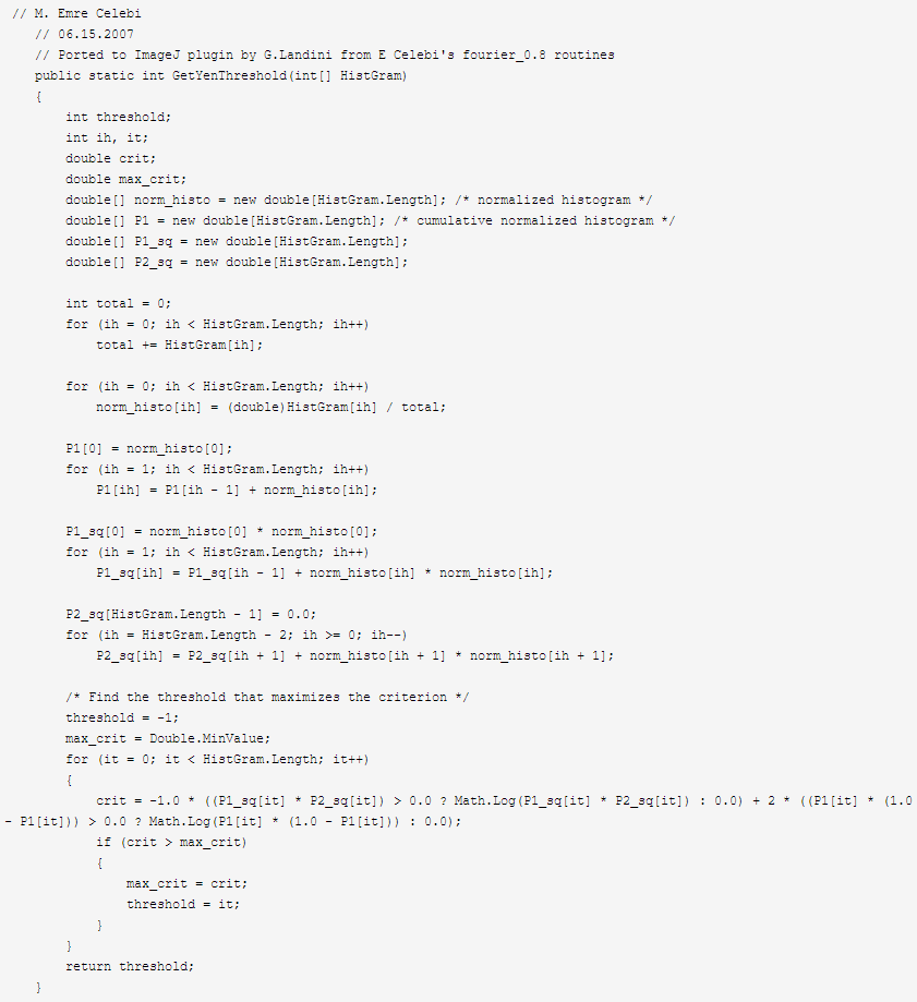 1) Yen J.C., Chang F.J., and Chang S. (1995) "A New Criterion for Automatic Multilevel Thresholding" IEEE Trans. on Image Processing, 4(3): 370-378