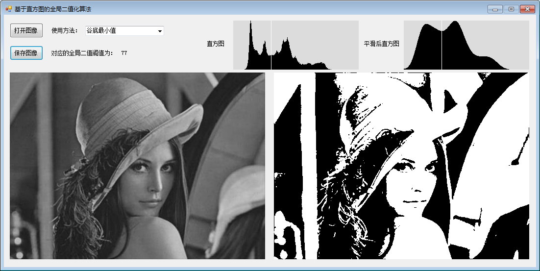 此方法实用于具有明显双峰直方图的图像,其寻找双峰的谷底作为阈值,但是该方法不一定能获得阈值,对于那些具有平坦的直方图或单峰图像,该方法不合适。