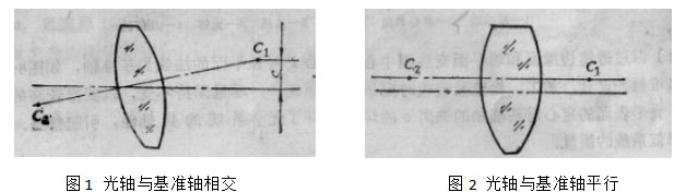 定心的目的是使中心线与机械中心线合而为一,另一功能则是控制镜片的外径达到公差配合。为了满足光学成像的要求,需要保证镜片的光轴在一条直线上。但在加工与装配时的镜片是以外圆进行定位,但单单依靠外圆定位,无法保证光轴一致性,那么就要求透镜在生产过程时要有定心磨边这一步骤。精磨抛光后的透镜一般都还未定心,此时存在的中心误差,中心误差会有两种情况:透镜自身光轴与系统理想光轴交叉(图1),透镜自身光轴与系统理想光轴平行的情况(图2)。