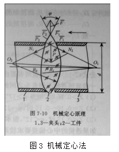 定心的方法很多,可以归类为光学定心法、机械定心法、激光定心法、光电定心法。光学定心又可以分为透镜表面反射像定心法、球心自准反射像定心法、透射像定心法和电视定心法等。简单介绍一下机械定心法,当透镜处于非定心状态时,由于其边厚不等,则透镜受力不平衡。这时由弹簧产生的支反力,可分解成垂直于夹头端面的夹紧力和垂直轴线的定心力(图3)。