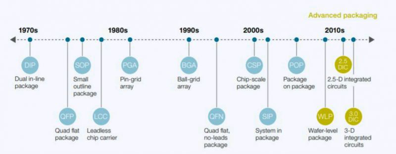 先进封装包括倒装(Flip-Chip),凸块(Bumping),晶圆级封装(Wafer Level Packaging,WLP),2.5D封装(interposer, RDL等),3D(Through Silicon Via,TSV,硅通孔)等技术。其中,SiP 技术以及 PoP 技术奠定了先进封装时代的开局,2D集成技术,如 WLP,Flip-Chip 以及3D 封装技术,TSV等技术的出现,进一步缩小芯片间的连接距离,提高了元器件的反应速度。