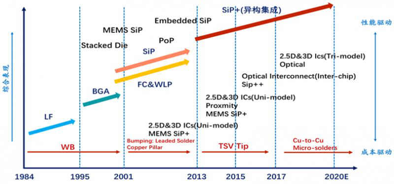 由于传统封装技术的封装效率较低(裸芯面积/基板面积)较低,不能满足电子器件的需求。在芯片制程受限的情况下,改进封装技术是唯一的选择。先进封装技术通过以点带线的方式实现电气互连,实现更高密度的集成,大大减小了对面积的浪费。