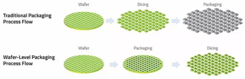 在传统封装概念中,晶圆是先被切割成小的晶粒,之后再进行连接和塑封。晶圆级封装是对整片晶圆进行封装测试后再切割得到单个成品芯片的技术,封装后的芯片尺寸与裸片一致。WLP具有两大优势:①将芯片的I/O分布在IC芯片整个表面,使芯片尺寸达到微型化极限;②直接在晶圆片上对众多芯片封装、老化、测试,从而减少常规工艺流程,提高封装效率。