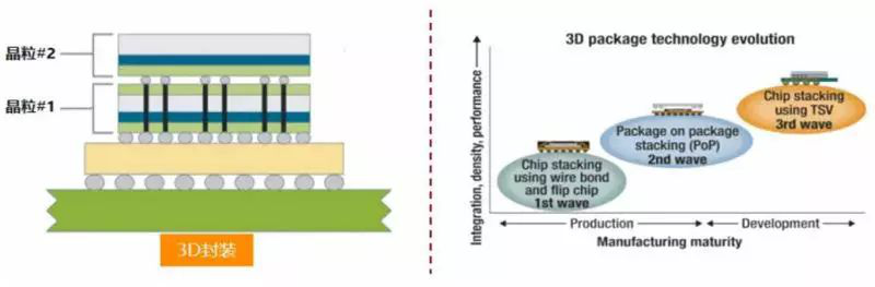 3D封装是指芯片在Z方向(垂直方向)上的垂直互连结构。3D封装可以大幅度缩小尺寸,减轻40-50倍重量,提升一倍硅效率,同时缩短延迟,降低成本。目前3D封装可通过引线键合、倒装凸块,POP(堆叠封装)、TSV(硅通孔)技术实现。