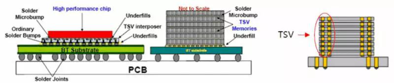 TSV是通过在芯片和芯片之间,晶圆和晶圆之间制造垂直通孔,通过Z方向通孔实现互联。TSV实现了贯穿整个芯片厚度的电气连接,更开辟了芯片上下表面之间的最短通路。与IC引线键合和使用Bumping技术不同,TSV能够在三维方向使得堆叠密度最大,而外形尺寸最小,大大改善芯片速度和低功耗性能。但由于技术目前成本较高,主要应用于图像传感器、粘结板、存储器、逻辑处理器、MEMS晶圆级3D等高端封装。