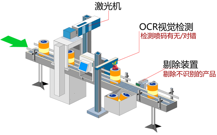 利用OCR字符检测系统检测瓶盖侧边上喷印的生产日期,如检测字符漏喷码、喷码缺失、数据有误等情况时,系统发出信号给剔除装置剔除处理或报警提示。