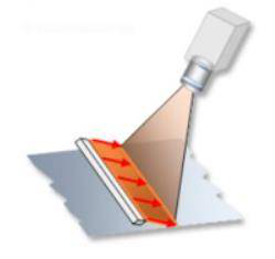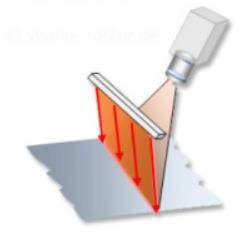 明场照明是使用线扫描相机进行表面检查的标准方法,摄像机和照明设备的布置方式应使摄像机处于照明设备的反射角(入射角=反射角)。以这种方式,尽可能多的入射光被检测到。这在反射材料的情况下特别有效。以这种方式,明亮的区域显示为明亮,黑暗的区域为黑暗。如果表面结构的角度不适合对齐而是倾斜,则它们在相机图像中也会显得很暗。表面的刮痕或倾斜的相位等在图像中具有较深的灰色阴影。