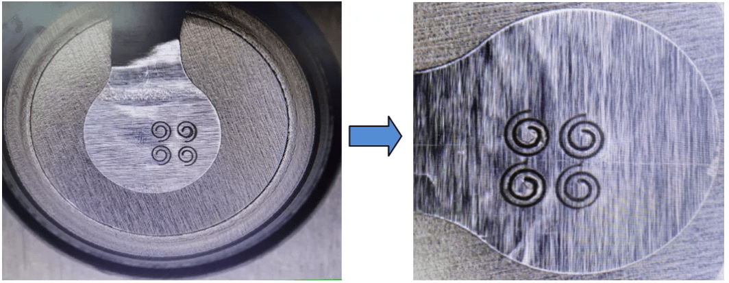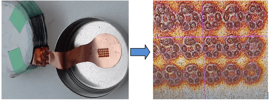 上图为纽扣电池电芯正极与不锈钢壳体的焊接成品图,正极为铝箔。铝材导电性较好,也属于高反光材料,对激光的吸收率较低,在20%左右。采用MOPA激光螺旋式焊接方式,焊接能量均匀,焊接点形状、熔深、牢固度一致性较好,外观平滑美观,无变形。焊接效果放大后如图2中右图所示,螺旋线焊接轨迹均匀,线条无虚焊,铝箔无变形,电池壳体背面无变色等不良情况,焊接牢固可靠,符合客户要求。