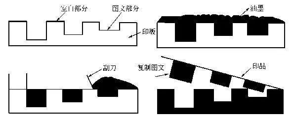 凸版印刷:凸版印刷的原理比较简单。在凸版印刷中,印刷机的给墨装置先使油墨分配均匀,然后通过墨辊将油墨转移到印版上,由于凸版上的图文部分远高于印版上的非图文部分,因此,墨辊上的油墨只能转移到印版的图文部分,而非图文部分则没有油墨。