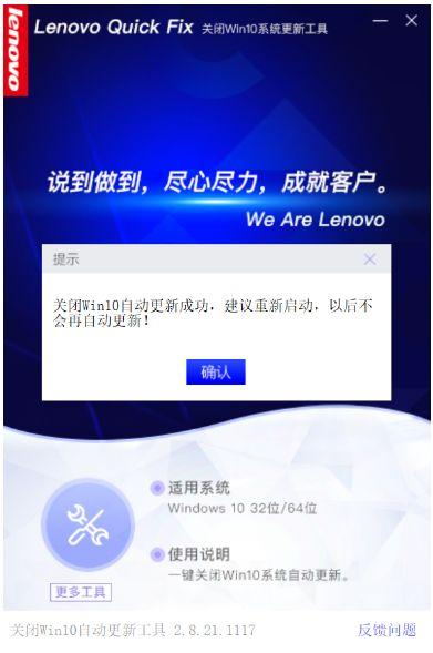 四、操作成功弹出相关的信息,点击“确认”回到工具首页,注意重启系统后则不会再自动更新