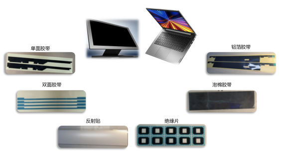 光学薄膜、偏光片、背光源、各种胶垫、背投灯元件处的反射板、扩散片、遮光胶带等。