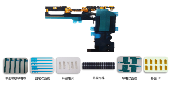 应用于FPC行业的产品:单面带胶导电布、固定双面胶、补强钢片、防震泡棉、导电双面胶、PI膜等。