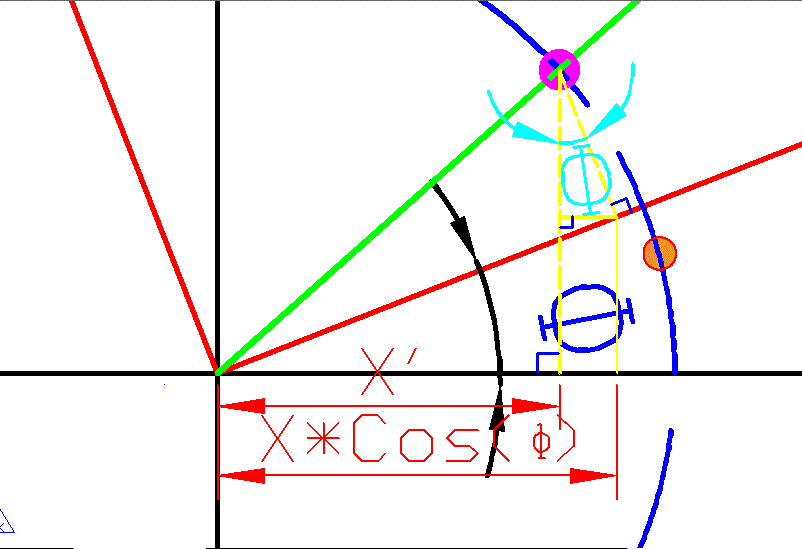图中我们很容易得到标注的两个角度相等,新点的横坐标X’等于下面尺寸标注的X*Cos(φ)-两条黄色的垂线间的距离,而这段距离我们可以在红色的新坐标系中很容易求出distance=Y * Sin(φ),所以很容易就得到了新点的横坐标