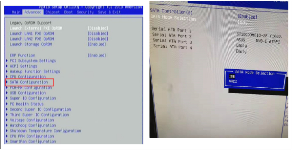 排查方法:在 windows 图标出现后立马蓝屏,这种现象多数是 SATA 模式不对导致,可以进入 bios 将 SATA 模式改成 IDE 或 AHCI。