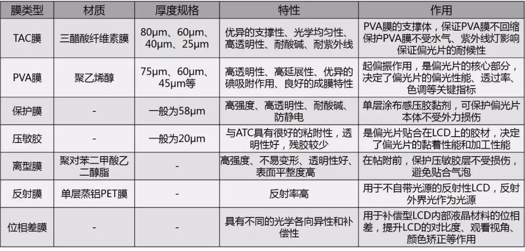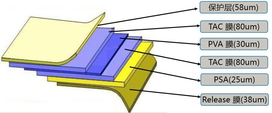 保护膜(protective film):为单侧涂布EVA层(乙烯醋酸乙烯共聚物)的PE(聚乙烯)膜,具有低粘性,起保护TAC膜表面的作用。