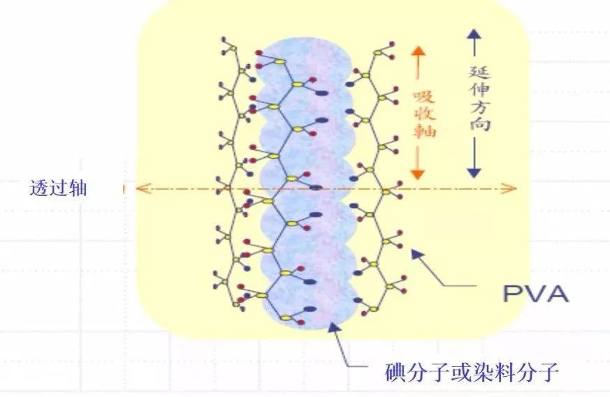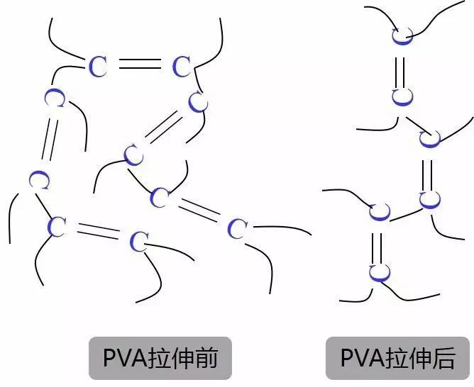 拉伸后的PVA分子沿拉伸方向直线排列,吸附在PVA层上的染料分子也跟随着有方向性的偏转,形成或染料分子的长链。因为碘离子(或染料分子)有很好的起偏性,它可以吸收平行于其排列方向的偏振光,只让垂直方向的偏振光通过,利用这样的原理就可制造偏光膜。