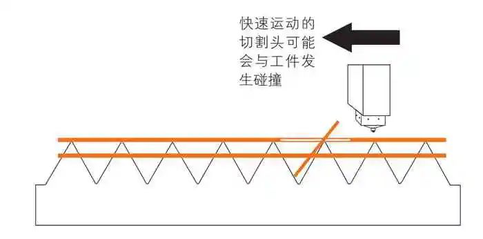激光切割在加工时,板料被锯齿状的支撑条托住,被切割下来的零件如果不够小,就不能从支撑条的缝隙中落下;如果不够大,就不能被支撑条托住,则可能失去平衡,发生工件翘起。而高速运动的切割头可能与之发生碰撞,轻则停机,重则发生损坏,如图7 所示。