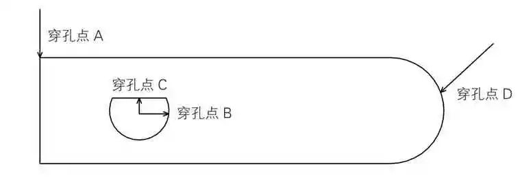 在激光切割加工过程中,激光束在材料上连续照射后在中心形成一个凹坑,进而与激光束同轴的工作气流很快会将熔融材料去除,形成一个小孔。此孔类似于线切割的穿线孔,激光束以此孔为加工起始点进行轮廓切割,通常情况下飞行光路激光束的走线方向和被加工零件切割轮廓的切线方向垂直。 因此,激光束在开始穿透钢板时到进入零件轮廓切割的这一段时间,其切割方向上将有一个很大的改变,由垂直于切割轮廓的切线方向转为与切割轮廓的切线重合,即与轮廓切线的夹角为0°,这样就会在被加工材料的切割断面上留下比较粗糙的切割面,这主要是由于在短时间内,激光束在移动中的方向变化过快导致。因此在采用激光切割加工零件时,必须注意此问题。一般来说,在工件对表面切割断口没有粗糙度要求时,可以在激光切割编程时不做手动处理,让控制软件自动产生穿孔点;若所要加工的工件切割断面有较高要求,就必须进行穿孔调整,通常需要在编制激光切割程序时对激光束的起始位置做手动调整,即人工对于穿孔点控制。需要把激光程序原来产生的穿孔点移到需要的合理位置,以达对加工零件表面精度的要求。 如图9 所示,若此工件对圆弧部分有切割面粗糙度要求,在编制激光切割程序时,切割起始(穿孔点)就要设置在A 和C,而不能设置在B 和D。而如果此工件只对直线边切割面粗糙度有要求,那么在编制激光切割程序时,切割起始点就要设置在B 和D,而不能设置在A 和C。 同样的,如图10 所示,如果此工件外形设计对圆弧有精度要求,我们在编制激光切割程序时,切割起始点(穿孔点)就只能设置在D,而如果此零件只对直线边的精度有要求,那我们在编制激光切割程序时,切割起始点(穿孔点)就可以选择除了D 点以外的任何点了。