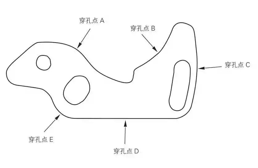 集中穿孔,也称为预穿孔,实际上是一种加工工艺,一般激光切割设备并无此功能。比如激光在切割较厚的板材时,每一个轮廓的切割加工都要经历穿孔和切割两个阶段。而常规的加工工艺为穿孔→切割轮廓1 →穿孔→切割轮廓2,如图4 所示,其中小圆点是穿孔点,箭头是切割路径顺序。
