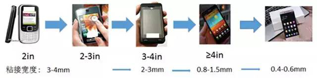 随着人们对手机显示面积及屏占比的要求越来越高,手机镜片粘接宽度从最初的3~4mm, 减小到目前的0.4~0.6mm,甚至有的厂家在研究0.4 mm以下的方案,如图2 所示。