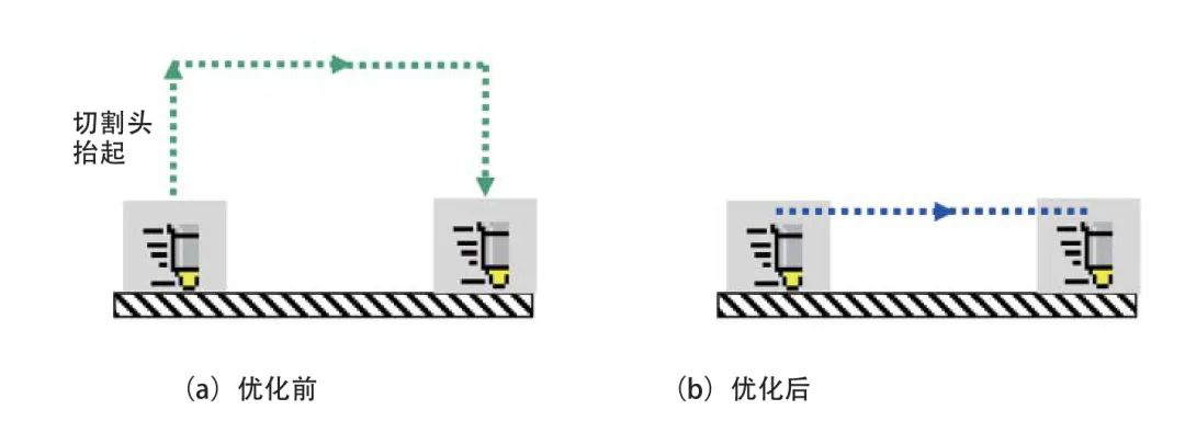 图3 切割头抬起动作优化前后对比图(虚线为切割头运动路径)
