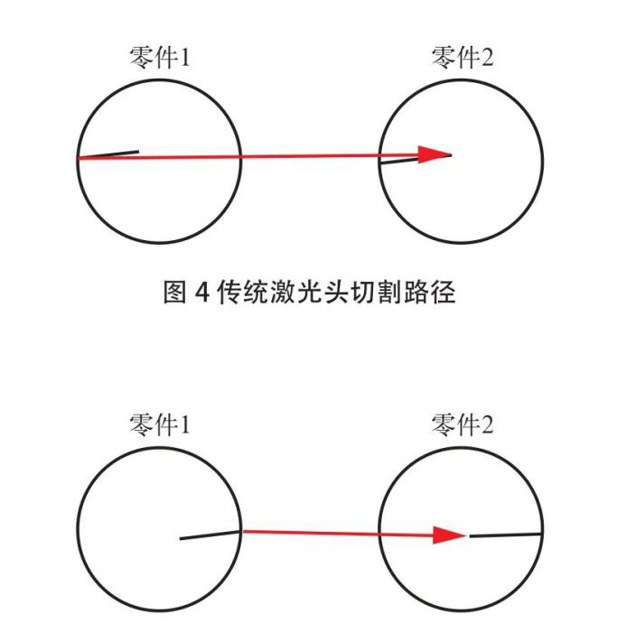如图4所示,零件1割完后,切割头直接沿着红线移到零件2位置做切割,应该避免下面这种情况,如果零件1未采用微连接的话,零件容易翘起来,当切割头从上方走过时,零件会和切割头发生碰撞。