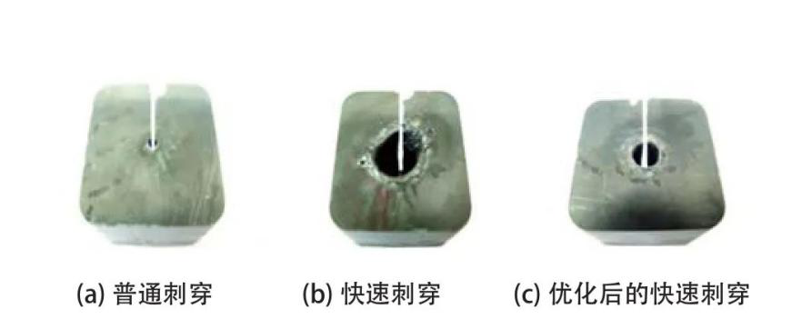 如图6所示,为普通刺穿和快速刺穿的比较,很明显快速刺穿的孔要大于普通刺穿,其对轮廓边缘的影响也大于普通刺穿。