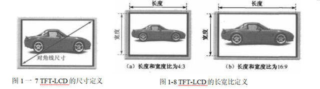 (2) 长宽比(Aspect Ratio):长宽比就是TFT-LCD可视区域的长度和宽度之比,也叫纵横比或屏幕比例。TFT-LCD的长宽比主要有4:3,5:4,16:10,16:9四种。早期影视画面比例都是标准的1. 33:1(即4:3),所以最适合用4:3的屏幕(如图l-8(a))来观看。而16:9的比例(如图l-8(b))更接近黄金分割比,人眼观看更舒服。因为长宽比也叫纵横比,所以在TFT- LCD产品设计时,一般用HCHorizonta 1)表示长度,V(Vertical)表示宽度。