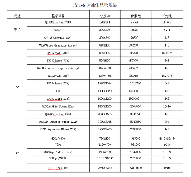 (4) 分辨率(Number of Pixels):TFT-LCD的分辨率表示有效显示区域内可以用做画面显示的发光点数@ ,TFT-LCD中的发光点称为像素(Pixel) O分辨率一般以乘法形式表现,如1024X768的分辨率,其中1024表示有效显示区域水平方向显示的像素数,768表示垂直方向显示的像素数。分辨率体现的是有效显示区域的像素总数,分辨率越高,画面的解析度(Resolution)也就越高。一般,人眼对垂直方向的像素数更敏感。拥有更高的垂直方向分辨率,画面 的清晰度就更高。表1-6罗列了一些基本的标准化分辨率规格。在实际使用时,显卡输出的分辨率(屏幕分辨率)和该TFT-LCD面板的固有分辨率(物理分辨率)相同时,显示效果最好, 即所谓的"点对点”显示。在表1-6中,公用中间分辨率格式(Common Intermediate Format, CIF)的分辨率为352X288。i是隔行扫描的英文interlace的第一个字母,p是逐行扫描的英文progressive的首字母。