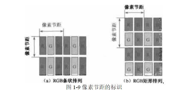 (5) 像素节距(Pixel Pitch):像素节距是TFT-LCD有效显示区内相邻两个像素间的距离,即像素重复单元的最小长度。TFT-LCD的像素节距类似于CRT的点距(Dot Pitch)oTFT-LCD的节距是固定的,节距的计算方式是以面板尺寸除以分辨率所得的数值,具体计算会在显示屏设计章节中详细介绍,对于彩色TFT-LCD而言,像素包含R、G、B三个子像素。一般,对普通的像素条状排列方式,节距的标识如图l-9(a)所示。对于特殊的像素排列方式,节距的标识不同,图l-9(b)给出了RGB矩形排列时的节距标识。“点对点”显示时,像素节距 和字体的大小是对应的,像素节距小,文字就小。画面的细腻度也是由节距来决定的,像素节 距越小,画面越细腻。更准确地体现画面细腻度的指标是PPKPixel Per Inch)值或DPKDots Per Inch)值,即单位尺寸(25. 4mm)内的像素数目。高精细的TFT-LCD具有高PPI值(或DPI值),像素节距越小,PPI值或DPI值越大。