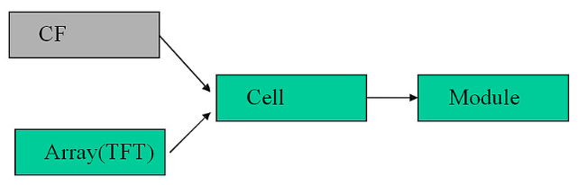 TFT 显示器的生产可以分成四个工序段:CF、TFT、Cell、Module。其相互关系见下图: