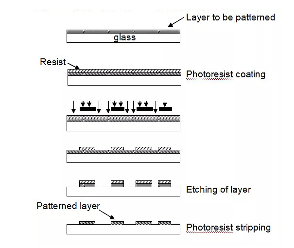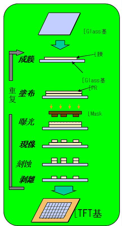 在上面的工艺流程中,我们提到,阵列的工艺流程是成膜、光刻、刻蚀等工艺制程的反复使用。以下就这些工艺制程作具体的介绍。