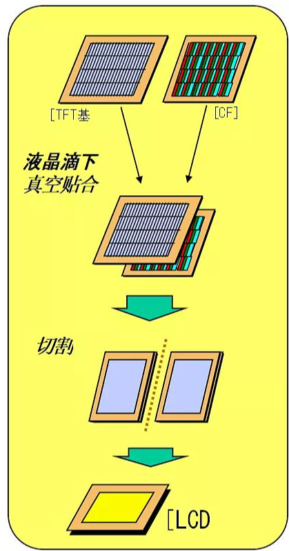 Cell 工序是从将TFT 基板和 CF 基板作定向处理后对贴成盒,到切割成单粒后贴上片光片。具体见下图: