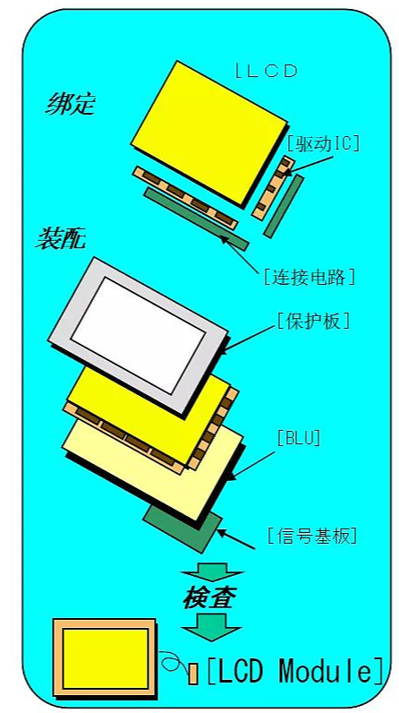 Module 工序是从 LCD 屏开始到驱动电路制作完成,形成一个显示模块。具体示意图如下: