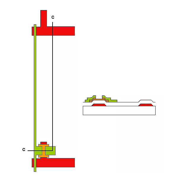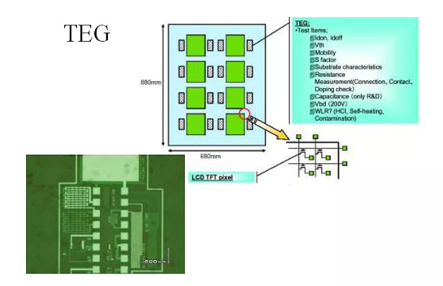 在阵列制作的工艺过程中,有许多中间环节的电气性能直接影响到产品的最终性能,必须加以检测。如层间的接触电阻,电极间的电容等。为了检测这些中间环节的电气性能,会在正常显示屏电气线路以外的区域,专门设计一些检测中间性格的电气单元(Test Element Group),并通过专门的TEG 检测设备作测试。常见的TEG 电气单元有: 引线电阻、TFT、存储电容、接触电阻、跨越台阶的引线电阻等。TEG 的位置及设计范例如下图:
