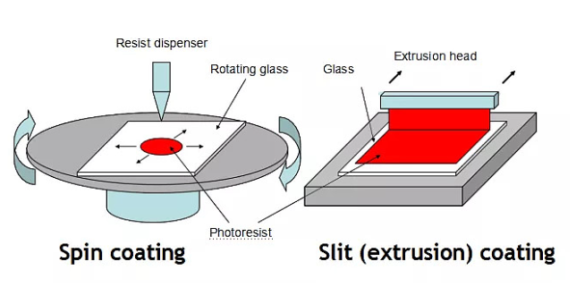 在玻璃表面涂布一层光刻胶的过程叫涂胶。对于小的玻璃基板,一般使用旋转涂布的方式。但对大的基板,一般使用狭缝涂布的方式。见以下示意图: