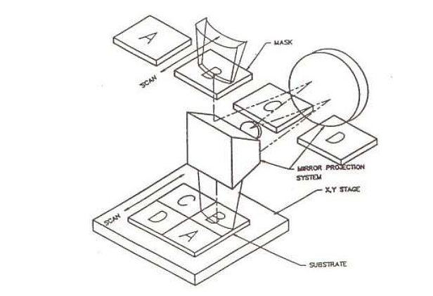 涂胶后的玻璃基板经干燥、前烘后可以作图形曝光。对于小面积的基 板,可以采用接近式一次完成曝光。但对大面积的基板,只能采用多次投影曝光的方式。下图是Canon 曝光机的工作原理图:
