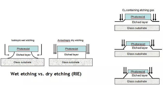 干刻是利用等离子体作为刻蚀气体,等离子体与暴露在外的膜层进行反应而将其刻蚀掉。等离子体刻蚀有各向异性的特点,容易控制刻蚀后形成的截面形态;但但高能等离子体对膜的轰击会造成伤害。湿刻与干刻的原理见下 图: