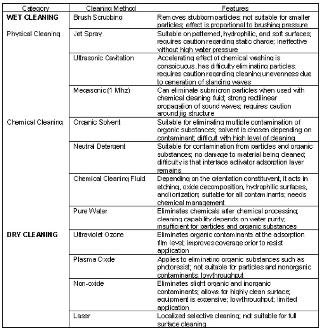 清洗,顾名思义就是将玻璃基板清洗干净。这是整个LCD工艺流程中使用最频繁的工艺制程。在每次成膜前及湿制程后都有清洗。清洗有湿洗和干洗,有物理清洗和化学清洗。其作用和用途详见下表:
