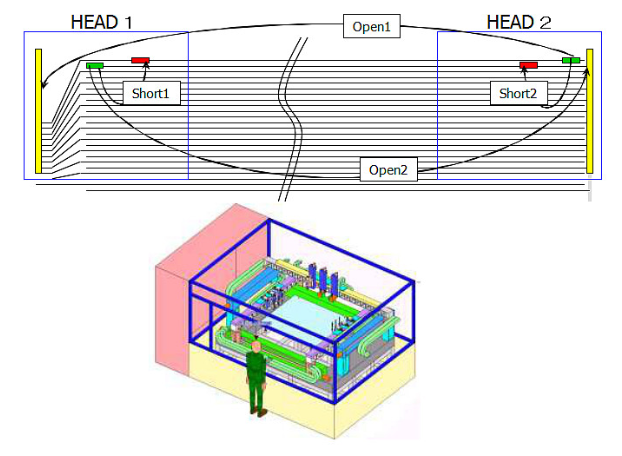 开路/短路电测的原理很简单:将两个探针放在电极的两端,检测电流以判断电极是否开路;将两个探针放在相邻的两个电极上,检测电流以判断这两个电极间是否短路。下图是原理的示意图和相关设备图: