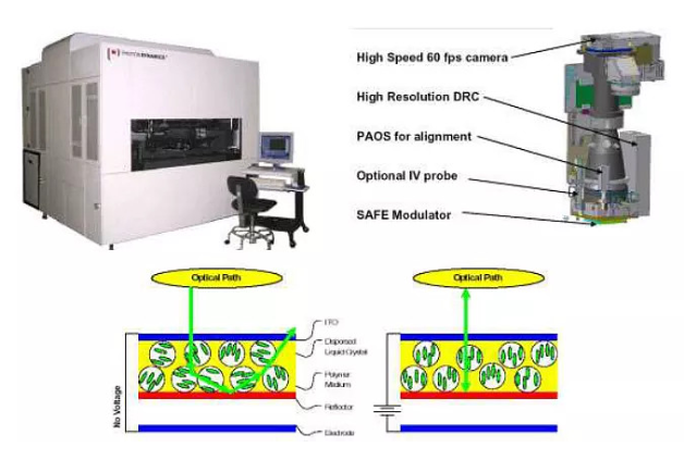 阵列电测大致分为电荷检测、电子束检测和光学检测三种检测方法。这三种检测方法各有优劣。目前天马采用光学的检测方法。其原理和相关设备见下图: