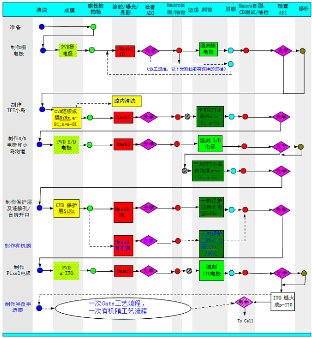 在主要工艺流程和制程的基础上,加入辅助工艺制程和返工流程,一个阵列段完整的工艺流程如下图: