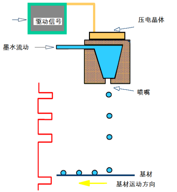 如上图1,喷墨打印是通过一定的驱动信号控制压电晶体部件,从喷头喷嘴中喷射出来离散的墨滴,一滴滴的墨点滴落到对应的基材上不同位置,最终形成所需要的图案
