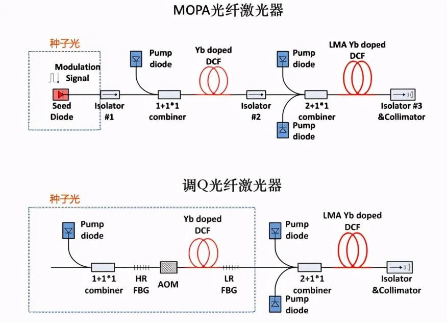 MOPA光纤激光器和调Q光纤激光器的内部结构原理示意图如下: