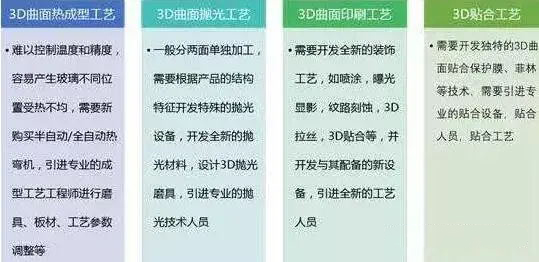 手机3D玻璃盖板生产加工工艺的流程主要包括:工程→开料开孔→精雕→研磨→清洗→热弯→抛光→检测→钢化→开模→UV转印→镀膜(PVD)→ 印刷(丝印/喷涂)→镭雕→检包→贴合→ 包装等,工艺流程长,品质要求高,而良率低。其难度主要体现在3D曲面成型、曲面抛光、曲面印刷、曲面贴合四大工艺上。