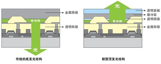 AMOLED也拥有底发光与顶发光两种结构。顶发光结构中,光线不会受到驱动电路的遮挡,相比底发光结构拥有更高的开口率,从而在高解析度的应用中具有更大的优势,因此逐渐成为了AMOLED的主流。