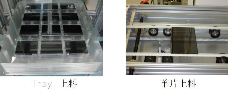 LCD loading有两种结构,可利用Tray盘上料(适合较小尺寸),也可人工单片放在机器传送带上(大尺寸)。单片放置时须注意间隔不要太密,避免造成LCD电极划伤。